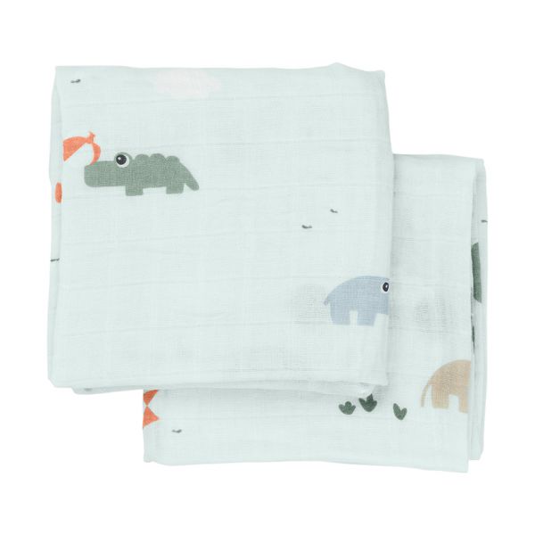 Deze set van **twee doeken** heeft een speels **Playground design** met **Elphee de olifant en Croco de krokodil**. Gemaakt van **100% biologisch katoen**, voelen ze heerlijk zacht aan en zijn ze vriendelijk voor de tere babyhuid. Bovendien zijn ze **machinewasbaar** en blijven ze langdurig mooi en zacht, zelfs na veelvuldig wassen.